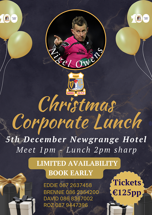 We are thrilled to announce that our special guest at this yearβs Navan RFC Christmas Corporate Lunch will be none other than:
